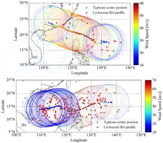Examples of the co-location of typhoons and RO profiles (red stars) based on a 600 km radius. The time windows are 36 h and 12 h in (a) Usagi (TY5) with COSMIC and in (b) Goni (TY12) with COSMIC-2. Colors indicate the wind speed in m/s.