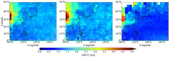 ABLH climatology during the local typhoon season (July–October). (a,b) are the results of reprocessed and post-processed COSMIC data, and (c) is the result of COSMIC-2 data.