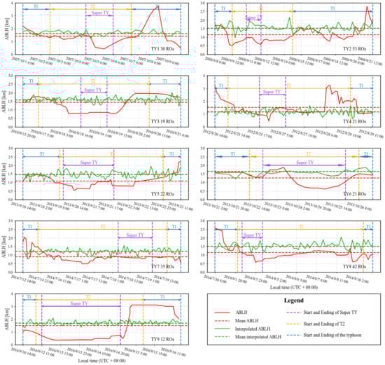 In Section 3.3, a 12 h time window was used to study the mean ABLH during the twelve typhoons. However, for TY1–TY9, nearly 40% of the typhoons’ central positions were co-located with no RO profiles, making it difficult to obtain continuous ABLH data along the typhoons’ tracks for investigating the characteristics of the variation in the ABLH. To address this issue, in this section a 36 h time window was adopted, which ensures that more than 95% of the typhoons’ central positions have at least one co-located RO profile. In fact, a 36 h window size is not ideal for studying the typhoons’ tracks. However, the amount of COSMIC RO data used in this study is fixed, and even if a typhoon’s central position is distant from the current typhoon central position within the 36 h window, the ABLH over both positions generally varies slowly in the temporal domain. For COSMIC-2, there is no need to consider the lack of data, because each typhoon central position can co-locate with at least one RO profile, except those located at latitudes higher than 45°. Therefore, if more than one co-located RO profile exists for a given typhoon, it is common to use different weights for different co-located RO profiles when calculating the mean ABLH for each typhoon central position; in this study, the Gaussian weighting function was used to determine the weight.