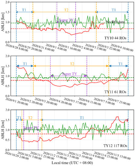 The results for TY10–TY12 are shown in Figure 8, which is based on COSMIC-2 profiles in a 12 h time window, and the legend of Figure 8 is the same as that of Figure 7. The ABLHs during the three typhoons have similar characteristics, including the fact that (1) the ABLH gradually decreased during the first T1 stage, (2) the ABLH maintained a low altitude during the T2 stage, which reached a minimum at the super TY stage, and (3) the ABLH gradually rose during the second T1 stage. Note that for the last part of TY10, no COSMIC-2 profile is available, because the track of TY10 moved into an area with a latitude of more than 45°.
