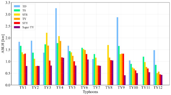 All the mean ABLHs discussed in previous sections are the results at the T1 and T2 stages, assessed for a preliminary investigation of the variation trend of the ABLH. In this section, the mean ABLHs at the six stages of each typhoon (also based on a 600 km spatial window and a 36 h time window for COSMIC, and a 12 h time window for COSMIC-2) are compared, as shown in Figure 9. Some missing data for TY6 and TY8 are the cause of the null bars in the figure. It can be seen that the mean ABLHs were higher at the stages of TD, TS, and STS than that at the stages of TY, STY, and super TY, which is consistent with T1 being larger than T2, as stated in Section 3.3. The ABLHs almost reached their maximum at the TD stage, while they reached their minimum at either the STY stage or the super TY stage. However, the variations in the mean ABLHs at TY3 and TY7 were abnormal, i.e., the ABLH values were low at the stages of TD and TS, but the values decreased with an increase in wind speed from the STS stage to the super TY stage, due to the recording of only six and one positions in the TD stage during TY3 and TY7, respectively. As such, their co-located RO profiles were of limited utility for obtaining a reliable result. For TY10–TY12, the mean ABLH also gradually decreased from TD to super TY, and the ABLH at the TY stage was slightly higher than that at the SYS stage during TY12 only.