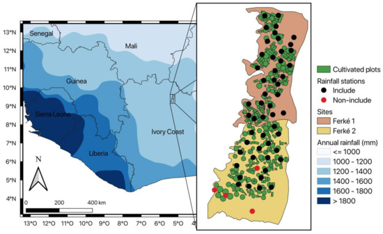 West-Africa map of mean annual rainfall (mm) with a zoom on the study area and the location of plots in the Ferké 1 and Ferké 2 sites. Rainfall data are CHIRPS product [34] data averaged over the years 1998–2018.