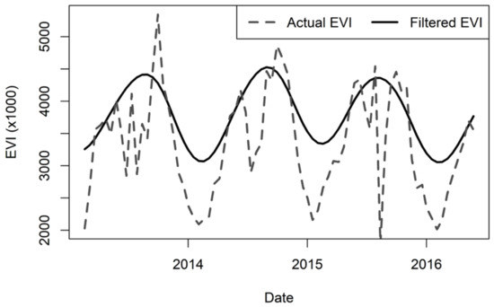 Satellite data are strongly affected by cloud cover, shadows, weather phenomena and noise introduced by sensors [41]. Therefore, it is necessary to clean up these data by smoothing and filtering anomalies. A Whittaker filter is used here. This smoothing is based on the minimization of a cost function describing the balance between fidelity to the measured values and the robustness of the estimates among them. It is simple to use and depends on a single parameter (lambda) controlling the inclination of the balance [42]. The Whittaker filter is a commonly-used method for smoothing NDVI data [43]. It is particularly efficient in filling large data gaps, and offers good accuracy and smoothing performance in comparisons with other methods [41,42]. A lambda value equal to 10,000 was used, as it provides good performance in terms of accuracy and efficiency. Figure 2 shows the actual EVI provided by the MODIS Vegetation Index as well, as the filtered EVI obtained with the Whittaker filter.