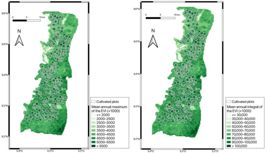 Map of the annual mean value of the maximum (left) and integral (right) of the EVI in Ferké 1 and 2 during the 2001–2019 period. All variables used in this study have been listed in Table 1.