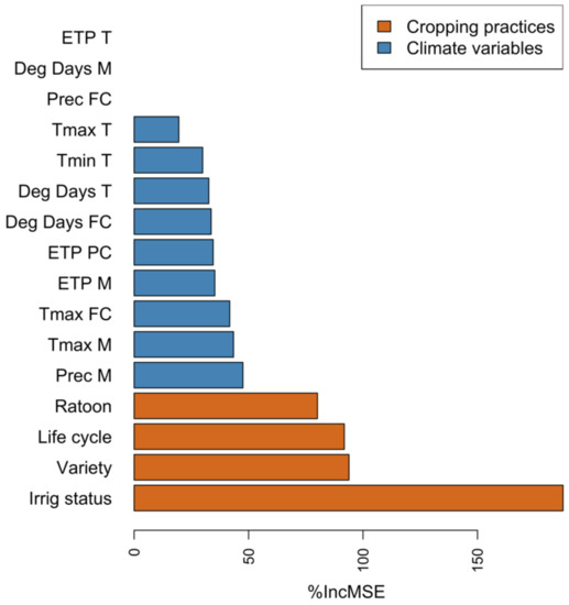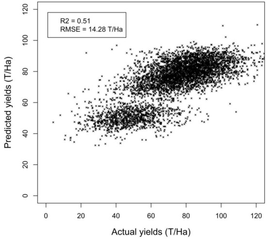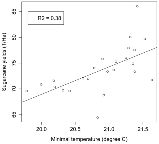 A relationship between rainfall and yields is often observed [60,61] but the model using the combination of rainfall and maximum temperature demonstrated the best performance in explaining the variations of sugarcane yields.