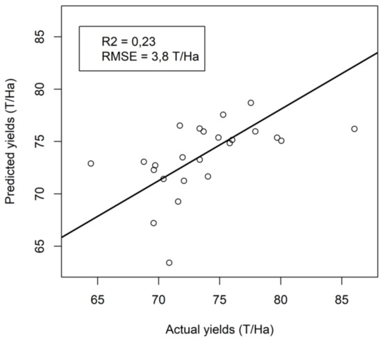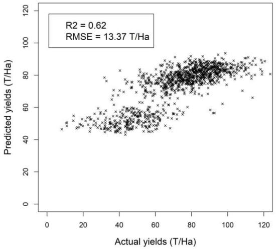 Figure 6 describes the values forecasted by the algorithm compared to the actual values. An average coefficient of determination for each forecast equal to 0.51 and an RMSE value equal to 14.28 tons per hectare was obtained. These results show that the forecasted values have a smaller standard deviation than the actual values, meaning that the algorithm was not able to detect conditions leading to extreme yield values.
