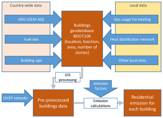 Since input data were taken from various sources, unification was a challenge. For example, heat distribution network data are stored in various formats following different standards in each of Poviat Centers for Geodetic and Cartographic Documentation (380 in Poland). Building a uniform database with a country-wide database required sending an official request for data access. When it was granted, the data were downloaded and processed to be included in the CED. The heat distribution network and other data served as proxies to determine which buildings have individual heat sources (and thus emit pollution) and which do not. This is a critical step in our methodology. We present a flowchart of our methodology in Figure 1.