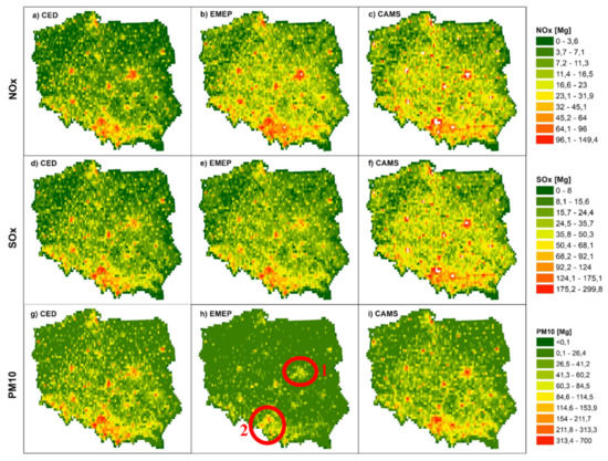 In summation, each emission inventory provided different results. For NOx and SOx, the CED data totals were the lowest, but they were highest for NMVOC, TSP, and CO. The PM10 and PM2.5 CED country totals were very close to those of the CAMS and relatively close in the case of CO. The EMEP was in the middle for SOx, CO, and NOx, but its obtained country totals were much lower than in other inventories for particulate matter. In general, disparities in the presented country totals are acceptable and can be explained by the different applied methodologies. Such discrepancies are not alarming since inconsistencies between emission inventories are well-documented [17,31,32,34,35,36,37].