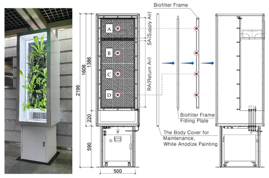 The vegetation biofilter system used in this study was a vertical hydroponic structure composed of a single panel. This system provides an indoor air purification area of approximately 0.6 m2 (Figure 2). The vegetation panel of the system has a multi-layered structure with three 50 mm active carbon pre-filters, and twenty-five air-purifying plants (Ficus elastica, Epipremnum aureum, and Dracaena sanderiana ‘Victoria’), selected based on the findings of a previous study [31], were planted. An irrigation port was provided at the bottom of the biofilter to supply water from the storage tank to the top of the panel using a pump. The automatic control unit was connected to the supply water for irrigation according to the irrigation cycle. A fan with a low-noise EC motor (single-phase/220 V, 2510 rpm, 0.17 kW) was installed at the top of the biofilter, providing an air conditioning performance of up to 800 m3/h and static pressure of 380 Pa. The applied fan offered an air-handling unit (AHU) function to the vegetation biofilter system. The polluted air is sucked in as the return air (RA) at the bottom, and purified air is supplied as the supply air (SA) at the top. The light fixture in the front of the biofilter was equipped with six LEDs (Cool White, 440–660 nm full spectrum, 0.2 W) for the vegetation.