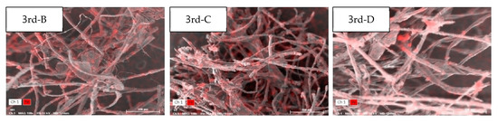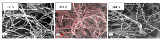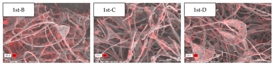In the SA samples collected in the first cycle, unlike C and O, Ca and Cl recorded a weight ratio of approximately 1 wt.%, and in contrast to the RA samples, Fe was not detected. Even in the second cycle, the weight ratio of Ca was less than 1 wt.%. However, Fe, which was not detected in the first cycle, presented the highest weight ratio (1.0% wt.%) among the SA samples of the previous cycle. In the third cycle (1 August), in addition to C and O, Ca had a weight ratio of 3.3 wt.%, and Fe exhibited a decrease in the weight ratio compared with that in the second cycle (0.4 wt.%).