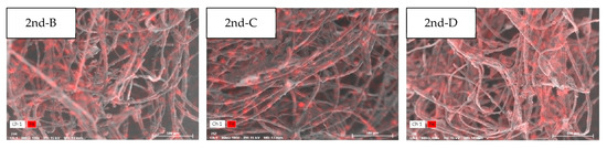 In the RA samples collected in the second cycle (28 June), the weight ratio of Fe was different at each sampling point: 9.6 at B, 5.5 at C, and 4.0 at D (Table 6 and Figure 4). There was also a difference from the analysis results in the data collected in the first cycle. At point B, a weight ratio (9.6 wt.%) similar to that of the first cycle was calculated. However, the weight ratios at points C and D increased by 1.7 and 10 times, respectively, compared to the values measured in the first cycle. In addition, Cl was the main element detected with Ca, with a weight ratio of 1 wt% or more. In this regard, Cl and Ca were interpreted as pollutants related to the abrasion of electric cables [34].