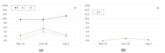 Table 5 and Figure 3 present the results of element analysis for RA samples collected during the first cycle. The weight ratio of Fe collected in the first cycle (23 May) was different for each sampling point. The average weight ratio at point B (9.6 wt.%) was higher than that at points C (2.3 wt.%) and D (0.4 wt.%).