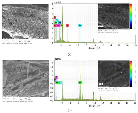 Figure 8 presents micrographs of typical Fe particles observed in the SA and RA of the vegetation biofilter. There were substantial differences in size, morphology, and composition among the samples collected. In sample B, Fe was the most abundant element at 71.32 wt.% (SD = 17.45); a similarly high Fe content was detected in samples C and D. Individual analyses suggested that this was due to the presence of iron oxides, such as FeO, Fe2O3, and magnetite Fe3O4, where Fe is mainly bound to O2. This observation is similar to that of a previous study [35]. The present study confirms the composition of Fe and partially detected metallic iron particles in the underground station. However, in sample A, Fe was detected at a trace amount of 1.44 wt.% (SD = 1.06). The Fe content in this sample was different from that in RA samples, and this change in the Fe weight ratio was identified as the cause of the change in the composition of Fe particles that passed through the vegetation biofilter.