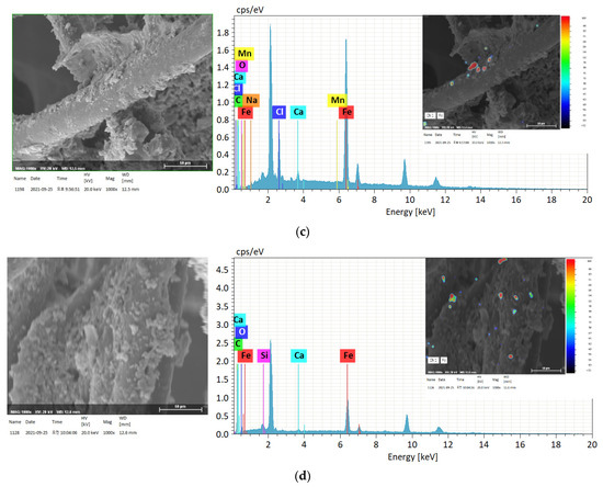 Al and Si, in addition to C and O, were found in most large- and medium-sized Fe particles; they were also confirmed as being bound to various alkaline or alkaline earth metals, such as Na, K, Mg, and Ca (Table 10). Several Fe-containing particles were found in the PM10 fraction. The sources of these particles include soil, road dust, weathered building materials, and geological materials, such as the gravel used on the rails [36]. Cl was also found at a significant weight ratio at sampling point C, as confirmed by the previous mapping analysis. The presence of both Cl and Ca can be attributed to a railway technology research project [37]; the abrasion of electric cables can be interpreted as the source of Cl and Ca in the underground station. In addition, some trace metals such as Mn were detected via individual analysis.