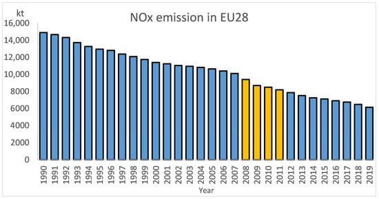 For EU27 countries, a decreasing trend of NOx emission is estimated in the EMEP inventory (Figure 1). A considerable reduction was in the transport sector (over 30%) due to EURO norms and energy processes (25%) caused by emission regulations for large sources [].