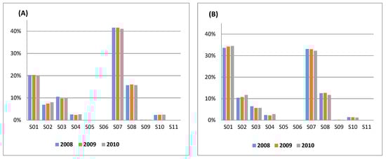 In each sector for the 2008–2011 period, we observe a stable tendency, allowing the implementation of coefficients calculated based on differences between 2008 and 2010 as a representative for 2011 (Figure 2). In the 2008–2010 period, the average emissions in the SNAP01 sector were 284 Gg. In the SNAP07 sector, the emissions were 273 Gg, and there was a slight decrease (about 1.1%) with respect to the total emission budget. Emissions from other vehicles and equipment (SNAP08) were approximately 102 Gg, which accounted for approximately 12% of the total emissions change from 2008 to 2010.