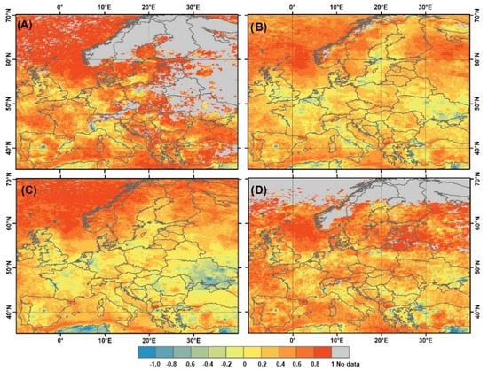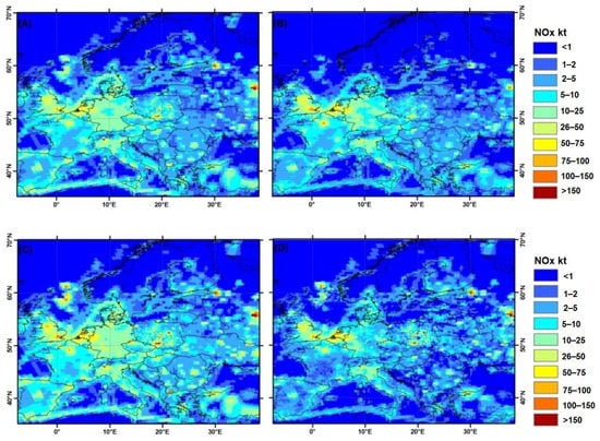 Figure 4 presents the spatial distribution of the emission correction factor for selected months in individual seasons. It was not possible to calculate the indicator, over the entire domain, for the winter months because of high cloud coverage. Negative values of the ratio indicate that the baseline emission should be increased, and the positive values of the calculated ratio indicate that the baseline emissions should be reduced. It should be noted that the negative values of the tropospheric NO2 columns that are caused by using the DOMINO method [] were not used in the calculations.