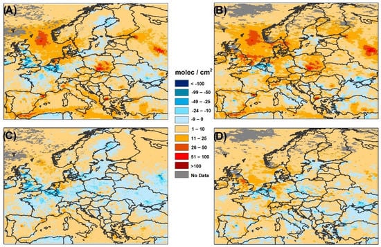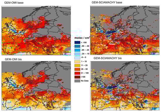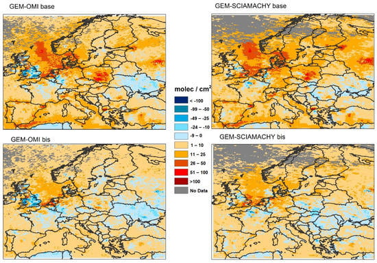 In January, the spatial pattern is incomplete due to the cloud coverage, especially in northern and eastern Europe (Figure 8). Over the rest, a slight reduction of the positive bias can be found over the south of Europe: Spain, southern France, north Italy, and the Mediterranean Sea (from 10 to 25 × 1015 molec/cm2). In the case of negative bias, no significant improvement was found.