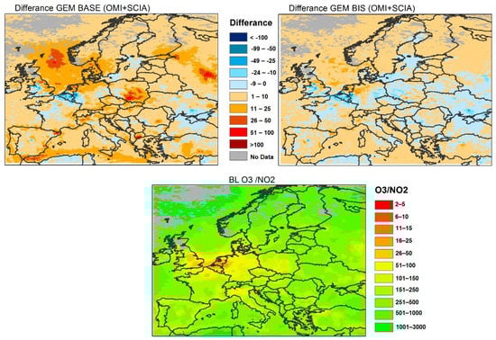 Figure 9 shows the average differences between the modelled tropospheric NO2 and the satellite observations averaged for two instruments for both simulations, as well as the O3/NO2 partial column ratio for the boundary layer for June 2011.