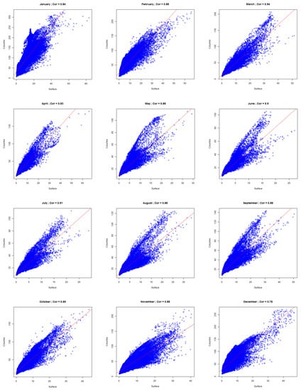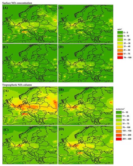 The relationship between the modelled surface NO2 concentrations and the value of the modelled tropospheric NO2 column is shown in Figure 11. A similar high correlation (>0.5) between OMI observations and ground-based in situ measurements was also recorded in important European Cities during 2005–2014 [].