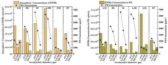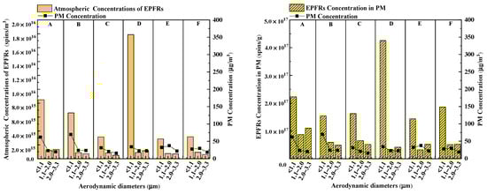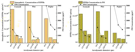 In our study, the simulated combustion experiments with raw coal and biomass were carried out in a relatively closed room, so the mass concentrations of collected particulate matter were much higher than those collected in open areas. Our results indicate that EPFRs attach more readily to fine particles, which may be due to the fact that fine particles have larger surface areas and more porous surfaces, leading to higher adsorption and retention of EPFRs [,,]. The distribution pattern in Figure 2, Figure 3 and Figure 4 showed that EPFR concentrations in each PM fraction increased as the particle size decreased. The main reason for the low concentration of EPFRs in our samples may be that our samples have been stored for too long, resulting in partial degradation. The above results suggest that the concentration of EPFRs in atmospheric particulate matter varies across regions and different combustion sources. However, to the best of our knowledge, the current studies on the concentrations of EPFRs in atmospheric particulate matter are limited to a few regions and a limited number of samples. In addition, more studies on EPFRs concentrations in atmospheric particulate matter samples from different regions, particle sizes, and sources are needed.