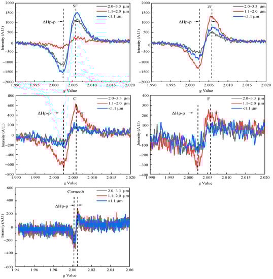 The g-factor and peak width (referred to as ΔHp-p, Gauss) were important parameters for identifying the type of free radicals [,], the average ΔHp-p was calculated to find the distance between the maximum and minimum y-axis values on the x-axis []. According to previous reports, carbon-centered radicals are generally less than 2.003, oxygen-centered radicals are generally greater than 2.0040, and g factors in the range of 2.0030–2.0040 are believed to correspond to a mixture of carbon- and oxygen-centered radicals [,,].