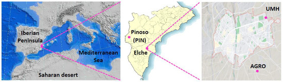 Geographical location of Elche in the southeast of the Iberian Peninsula and location of the selected monitoring sites.