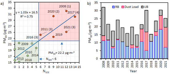 (a) Relationship between the number of days influenced by Saharan dust (NSDE) and the mean PM10 concentration measured at the AGRO station during the month of February over the 2008–2021 period. The figure also shows average values of PM10 (blue horizontal line) and NSDE (blue vertical line) for the study period. (b) Regional, urban, and mineral dust contributions (RB, UB, and dust load) to the monthly mean PM10 mass concentration in Elche during February from 2008 to 2021.