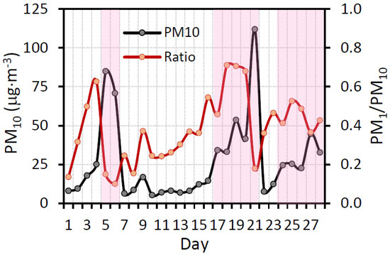 Figure 3 also shows the periods under the influence of Saharan events (shaded in pink) during February 2021. The third event lasted until the first days of March 2021, although the peak daily concentration was recorded on 27 February. During dust episodes, large increases in PM10 levels were observed, as well as a significant decrease in the PM1/PM10 ratio. The highest contribution of coarse particles was recorded during the first two episodes, with PM1/PM10 ratios below 0.2.