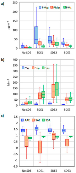 As shown in Section 3.1.2, particle mass size distributions for the three events detected during the study period were different. To study the impact of each episode on AOP, hourly data were used. Figure 4 shows PM mass concentrations, σsp, σap, the extinction coefficient (σext/σext = σsp + σap), AAE, SAE, and SSA for each of the three episodes. The values of these parameters in the absence of Saharan events (No SDE) are also shown.