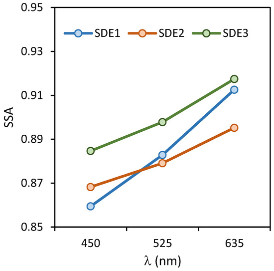 The impact of SDE on PM10 levels was highest during SDE1 (Figure 4a). In contrast, the largest contribution to the fine fractions was observed during SDE2. This affected σsp and σap values, as shown in Figure 4b. The median σap value during SDE2 (16.3 Mm−1) was considerably higher than during SDE1 (9.4 Mm−1), and the same was observed for σsp. As a result, the highest σext value was recorded during SDE2. SAE values (Figure 4c) were quite low both in the presence and absence of Saharan dust. The average SAE value during SDE1 (0.024) was the lowest due to the large contribution of coarse particles during this event. SSA mean values for the three episodes were very similar and close to 0.880 (Figure 4c). This value was higher than that recorded in the absence of events (0.776). Values close to or above 0.900 (λ = 520 nm) have been previously obtained in the Iberian Peninsula during Saharan events [17,39,40,41]. The spectral variation of SSA can provide useful information about the dominance of specific aerosol types (e.g., BC, organic carbon, dust, sulfates) during events [42,43]. Generally, SSA increases with wavelength for dust aerosols and decreases for biomass-burning and urban/industrial aerosols, while it exhibits almost neutral spectral dependence in the case of the aerosol mixture and sulfate particles [44,45,46]. In addition, an equal mixing of fine and coarse particles is produced when SSA is nearly independent of the wavelength [42]. Figure 5 shows the spectral dependence of SSA (450–635 nm). The slope of the line for SDE1 was significantly higher (almost twice) than for SDE2 and SDE3. This suggests that the contribution of MD was greater during SDE1 than during the other episodes.