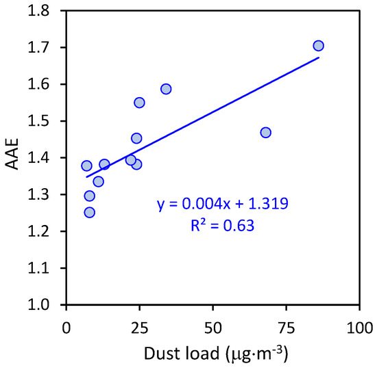 The highest mean AAE value was recorded during this first episode (1.525). AAE values during SDE2 and SDE3 were also slightly higher than those obtained in the absence of events. Therefore, it can be assumed that during both SDE, there was some contribution from MD to the absorption process. Figure 6 shows the relationship between AAE values and MD loads on event days (NSDE = 12). It can be observed that an increment in the MD load was linked with an increase in the AAE value. Similar results were obtained by Ealo et al. [15].