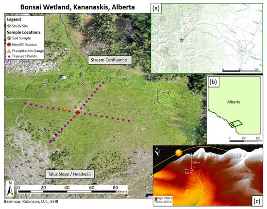 The study was conducted at Bonsai wetland, a subalpine headwater wetland (2083 m a.s.l.) on Fortress Mountain (50.82° N, 115.21° W) located 80 km west of Calgary, Alberta (Figure 1a). The study site is at a privately owned alpine ski resort in the Kananaskis Valley, which marks the front range of the Canadian Rocky Mountains. A tall (~500 m), steep headwall marks the southern boundary of the wetland, while an ephemeral tarn located 200 m to the north of the headwall marks the northern boundary. Canadian and Fortress Ridges (~150 m in elevation) are the drainage divides 500 m to the east and 1.7 km to the west of the wetland (Figure 1c). Classified as a marsh meadow according to the Windell et al. [30] classification scheme for Rocky Mountain montane and subalpine wetlands [31], the wetland is defined by silt and clay soils and shade tolerant vegetation like Equisetum, Salix and Castilleja raupii. Located directly beneath the headwall, it covers approximately 1 ha area (Figure 1c). The wetland is mostly flat, with an average slope of 6 degrees (a 3 m change in elevation over 50 m in horizontal distance) from the stream confluence to the talus slopes. The headwall to the south and ridge to the east of the wetland provide a topographic barrier to solar radiation, resulting in seasonal shading of the site. This shading creates a microclimate that promotes a thick snowpack, long snow-covered season, an extended spring melt and a constrained growing period compared to other more exposed areas on Fortress Mountain (Figure 2).