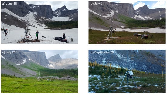 Figure 2. Images of the seasonal evolution of our research site during (a) Snow Melt, (b) Green-Up, (c) Peak Growing Season and (d) Late Growing Season. Images were taken during the 2018 field campaign on (a) 18 June, (b) 6 July, (c) 26 July and (d) 28 September.