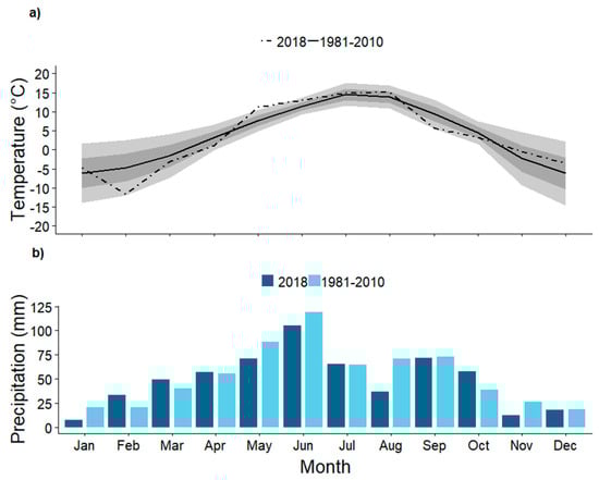 Figure 3. Comparison of 2018 air temperature, Tair (dashed line, (a) and precipitation (dark blue, (b) to that of the 30-year (1981–2010) climate normal measured at a nearby Environment and Climate Change Canada weather station. In (a) darker grey and lighter grey shaded areas represent one and two Standard deviations around the 30-year mean Tair (solid line), respectively.