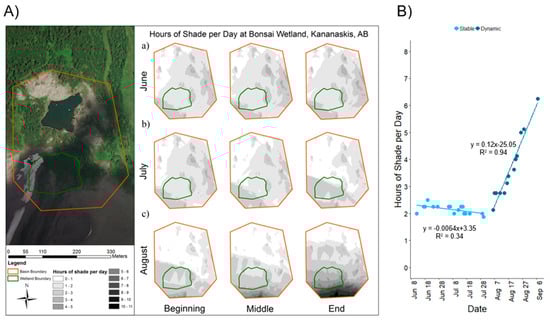Figure 4. (A) Horizon shade model results for the beginning, middle and end of each month for (a) June, (b) July and (c) August during the 2018 study period. Inset image illustrates the position and orientation of the study site (enclosed by the wetland boundary) relative to the surrounding topography, with the wetland boundary highlighted with a green line. (B) Stable Shade (7 June to 30 July), illustrated by light blue circles, has a consistent average daily shade value of 2 (y = −0.01x + 3.35, R2 = 0.34) while Dynamic Shade (31 July to 10 September), dark blue circles, increases rapidly over time (y = 0.12x − 25.05, R2 = 0.94).