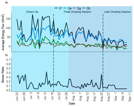 Maximum daily net radiation (Q*), sensible heat flux (Qh), latent heat flux (Qe) and ground heat flux (Qg), occurred on 20 June, 14 July, 17 July and 19 June, respectively (Table 1; Figure 5). The temporal difference in energy aligned with changes in maximum downwelling solar radiation (K↓) and shading. During the study period, maximum daily (24-h average) Q* (196 W/m2) occurred one day before the summer solstice when the sun was near its highest position in the sky (Figure 5). Even though the wetland was snow-covered and had a higher albedo in June, the summer solstice provided greater net energy due to longer days with less shading than later in the summer. When the site became entirely snow free in the middle of July, daily Q* was 100 W/m2, which was almost half the amount measured during the seasonal maximum on 20 June (Figure 5). Therefore, vegetation buried under snow throughout June (snow depth of 68 cm on 7 June and 25 cm on 19 June), could not utilize the daily seasonal maximum available energy (i.e., the difference between net and ground heat flux, Q*-Qg) for transpiration. Qg reached its maximum on 19 June, when large contributions of energy were used to thaw exposed ground during the period of peak snowmelt (Figure 5). Qe and Qh each reached their maximums in the middle of July, a typical time for peak vegetative productivity in mountain meadow and tundra ecosystems [61,62,63]. It was also beneficial for plants to have relatively “unobstructed” sunlight during Green-Up and the beginning of the Peak Growing Season.