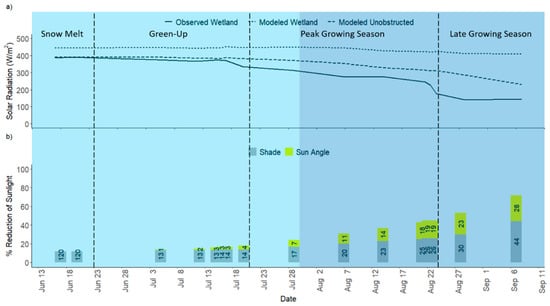 The shaded wetland site received 59, 97 and 140 W/m2 less radiation per hour than the unobstructed (ridge) location during the Green-Up, Peak Growing Season and Late Growing Season, respectively (Figure 6a). These hourly reductions translated to 1400 W/m2 more K↓ being intercepted by the headwall per day at the end of the study (10 September) compared to the beginning (17 June). On average, there was 951 W/m2 of intercepted K↓ per day during Stable Shade, compared to 1526 W/m2 of intercepted K↓ per day during Dynamic Shade. During the Dynamic Shade period, significant linear correlations were found between hours of shade and K↓ (R2 = 0.50, p < 0.05, y = −32.3x + 312.5) (Figure 8b). For every hour increase in shade, K↓ decreased by 32 W/m2. Shade also had a strong influence on modeled K↓, reducing it by 10% (35 W/m2) per hour during the period of Dynamic Shade (Figure 8b), which encompassed most of the Peak and Late Growing Seasons.