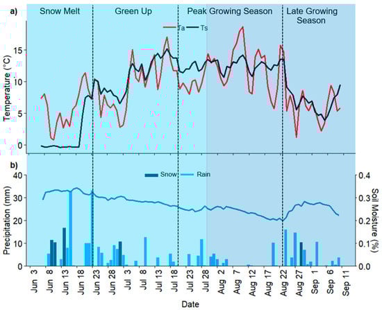 Figure 7. Climate trends observed over 2018 field season at our wetland site. (a) air temperature (Ta) and surface soil temperature (Ts) at 2 cm; (b) precipitation defined by snow and rain and soil moisture (measured at 10 cm depth in the middle of the wetland at the meteorological tower). The light blue vertical highlighted area represents the Steady shade period of our study and darker blue vertical highlighted area the Dynamic shade period.