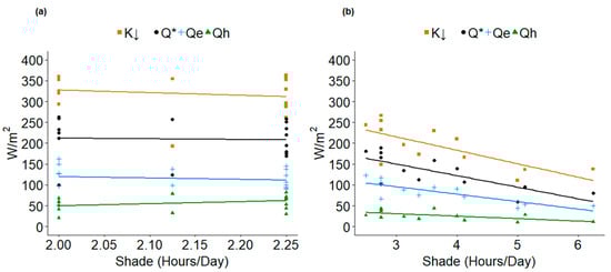During the Dynamic Shade period, significant linear correlations were found between hours of shade and Q* (R2 = 0.55, p < 0.05, y = −27.8x + 233.6), hours of shade and Qh (R2 = 0.29, p < 0.05, y = −5.9x + 48.4) and hours of shade and Qe (R2 = 0.63, p < 0.001 y = −17.9x + 149.4) (Figure 8b). For every hour increase in shade, during the Dynamic Shade period, Q*, Qh and Qe decreased by 28, 18 and 6 W/m2, respectively, at an average of 16% compared to the Stable Shade period.