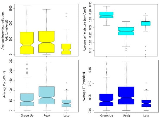 As the growing season progressed from Peak to Late season, shade decreased the amount of incoming radiation, which resulted in decreased Qe and increased soil moisture (Figure 9). This decrease was more pronounced compared to the seasonal increase from Green-Up to Peak Growing Season. The overall result was also a pronounced decrease in ET during the Late Growing Season (Figure 9).