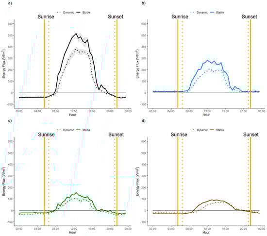 Figure 10. Diurnal Peak Growing Season energy budget contributions defined by (a) net radiation (Q*), (b) latent heat flux (Qe), (c) sensible heat flux (Qh) and (d) ground heat flux (Qg) for Stable Shade (21 July to 30 July) and Dynamic Shade (31 July to 23 August). 95% confidence intervals are shaded around each diurnal flux, while the average sunrise and sunset for Stable Shade (solid) and Dynamic Shade (dashed) are also listed.