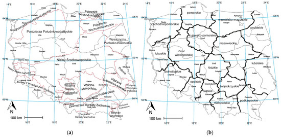 Distribution of weather stations in Poland: (a) geographical regions; (b) voivodeships. PL-EN: Beskidy Wschodnie-Eastern Beskids, Centralne Karpaty Zachodnie-Central Western Carpathians, Niziny Sasko-Łużyckie-Lowlands Sasko-Łużyckie, Niziny Środkowopolskie-Central Polish Lowlands, Pobrzeża Południowobałtyckie-South Baltic Coast, Pobrzeża Wschodniobałtyckie-Eastern Baltic Coast, Podkarpacie Wschodnie-Eastern Subcarpathia, Pojezierza Południowobałtyckie-South Baltic Lakes, Pojezierza Wschodniobałtyckie-Eastern Baltic Lakes, Polesie–Polesie, Północne Podkarpacie-Northern Subcarpathia, Sudety z Przedgórzem Sudeckim-Sudety Mountains with the Sudeten Foreland, Wysoczyzny Podlasko-Białoruskie-Podlasie-Byelarus Uplands, Wyżyna Lubelsko-Lwowska-Lublin-Lviv Upland, Wyżyna Małopolska-Małopolska Upland, Wyżyna Śląsko-Krakowska-Silesia-Cracow Upland, Wyżyna Wołyńsko-Podolska-Volyn-Podolia Upland, Zewnętrzne Karpaty Zachodnie-Outer West Carpathians.