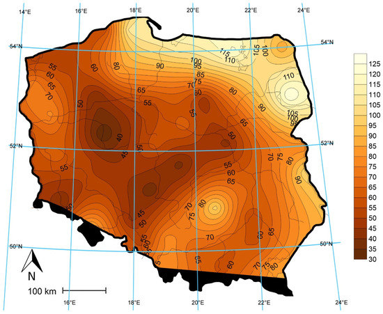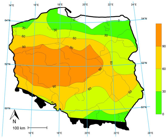 The summer drought in terms of periods of low precipitation frequency began on 29 May with the change from cyclonal to anti-cyclonal circulation, which lasted for very different periods of time reaching 100 days in Warsaw and 101 days in Zielona Góra, i.e., until the first days of September. The longest period, i.e., exceeding 90 days, occurred at stations located in the Central Poland Lowlands (up to Warsaw) and the southern part of the South Baltic Lake District. On the outskirts of the mentioned area and in the Lublin Upland, the length of this period was shorter, of the order of 60–90 days. In the Sandomierz Basin and lower parts of the Sudety Mountains, it was a period of 30–60 days, and, in the Carpathian, the period lasted from several to twenty days. On the South Baltic Coast in its western and central part, this period lasted from 30 to 30 several days, while, in the Podlasie–Byelarus Uplands and Podlasie, the period lasted in between 35–37 days. In the surroundings of the Gulf of Gdańsk, the Eastern Baltic Coast, and the Lake Districts, the period of low precipitation frequency did not occur (Figure 2).