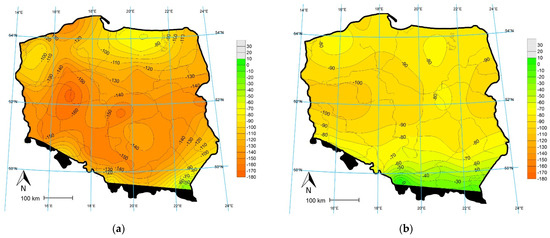 In June 2019, the greatest water deficit occurred in the central Poland belt, especially its central and western parts with a maximum in Poznań at 176.6 mm. The water deficit decreased towards the north, south, and east. The lowest values of water deficit occurred in Eastern Baltic Coast and Lake Districts with the minimum of −71.3 mm in Kętrzyn. Lower deficit values were recorded in southern Poland with a minimum of −34.1 mm near Lesko. The mean value of CWB in Poland was −129 mm (Figure 4a). In June 1981–2010, the highest water deficit occurred in central Poland, especially in its central and western part with its maximum in Poznań at 106.7 mm. Water deficit decreased towards the north and south. The smallest deficit values occurred in the Eastern Baltic Coast and the Lake Districts with the minimum of −69.5 mm in Koszalin. Much lower values of deficit were recorded in southern Poland with a minimum of −12.9 mm near Lesko. The mean value of CWB in Poland amounted to −79 mm (Figure 4b).