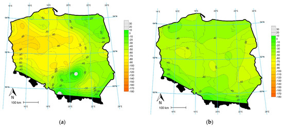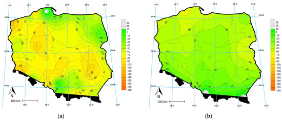 In July 2019, the largest water deficits occurred in the western part of the South Baltic Coast with a maximum of −109.8 mm in Świnoujście. Slightly lower values were observed in central Poland ranging from −60 mm to −90 mm. The lowest values of water deficit were observed in the eastern part of South Baltic Coast, Eastern Baltic Coast and Lake Districts and locally in the south of Poland. In the vicinity of Katowice, an excess of 6.1 mm was recorded. The average CWB over Poland was −64 mm (Figure 5a). In July 1981–2010, the highest water deficits occurred in western part of the South Baltic Coast with a maximum of −69.9 mm recorded in Ustka. Slightly lower values were observed in central Poland ranging from −30 to −60 mm. The lowest values of water deficit occurred in the southern part of Poland. In the vicinity of Bielsko–Biała and Lesko, an excess of water was recorded, at 19.1 and 13.5 mm, respectively. The mean CWB value over Poland was −36 mm (Figure 5b).