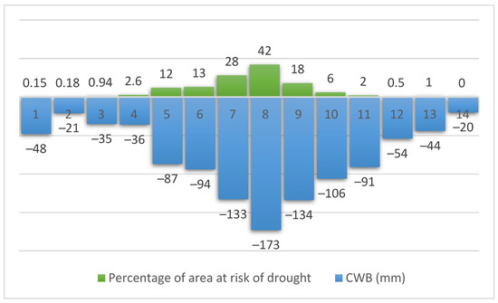 In light of the comparison presented, June saw with the highest temperature deviation from normal and low rainfall, and was the month with the highest CWB deviation of 50 mm. The values of these deviations from normal decreased to −28 mm in July and −15 mm in August (Table 1).