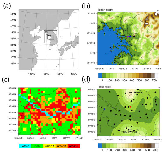 (a) Domain configuration of the WRF model simulation, (b) the horizontal distribution of terrain height in domain 3. The black box in domain 3 denotes the analysis domain of the Seoul Metropolitan Area, and the horizontal distribution of (c) land use and (d) terrain height in the analysis domain in this study. In (b), the location of observation stations is marked by dots (purple: Gongchondong, blue: Gimpo airport, black: Seoul, red: Gwanghwamun, yellow: Osan). In (d), black dots indicate all of the AWS and ASOS stations in the analysis domain.