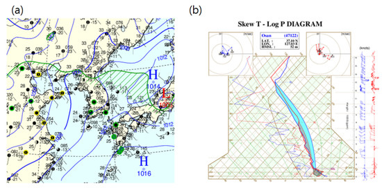 (a) Surface weather chart, and (b) Skew T–Log P diagram at Osan station at 1500 LST on 6 July 2017 (blue line: 1500 LST, red line: 2100 LST, solid line: temperature, dot line: dew point temperature) (Source: Korea Meteorological Administration).