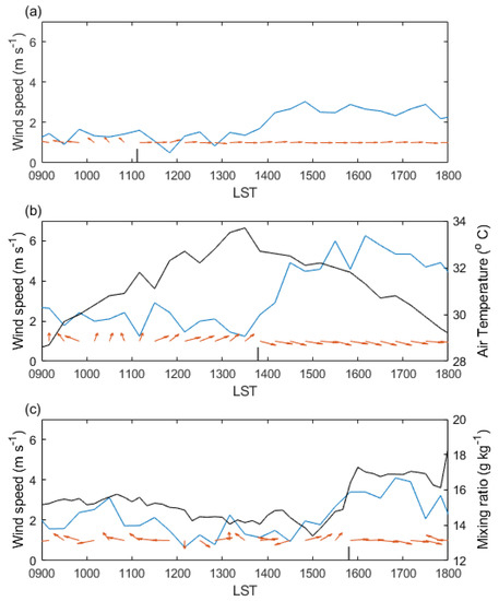 The time series of wind direction (arrow) and speed (blue line) for (a) Gongchondong, (b) Gimpo airport, and (c) Seoul station. The black line in (b) and (c) indicates air temperature and the mixing ratio, respectively. The black vertical line indicates the arrival time of the sea breeze front (SBF).